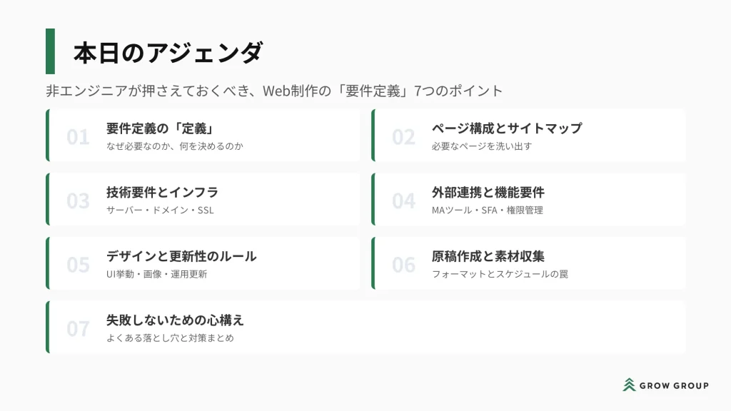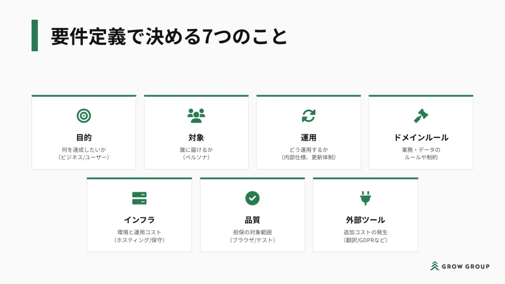非エンジニアが押さえておくべき、Web制作における要件定義の7つのポイントは下記の通り。