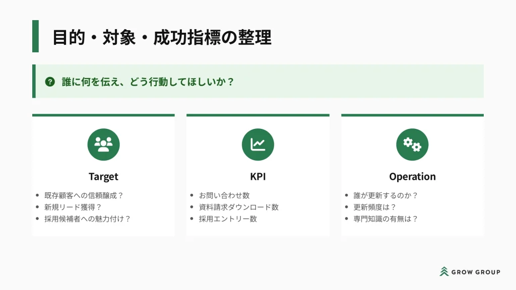 そのうえで、顧客にヒアリングしながら目的・対象・成功指標の整理を行い、プロジェクトメンバー全員で共通の認識を持っておくことで、プロジェクト後期になってから認識のずれや方向性の違いが発覚・・・という事態を防ぐことができます。