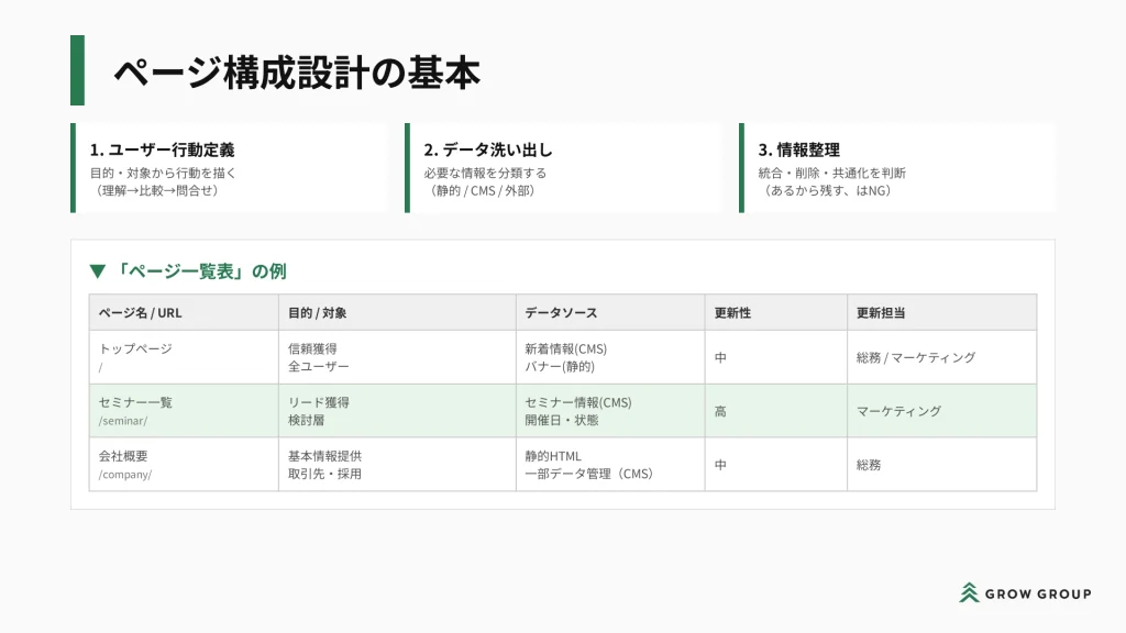 資料のように一覧表にし、ページ単位で更新性や、想定している更新担当者/体制についても、整理しておくことをおすすめします。