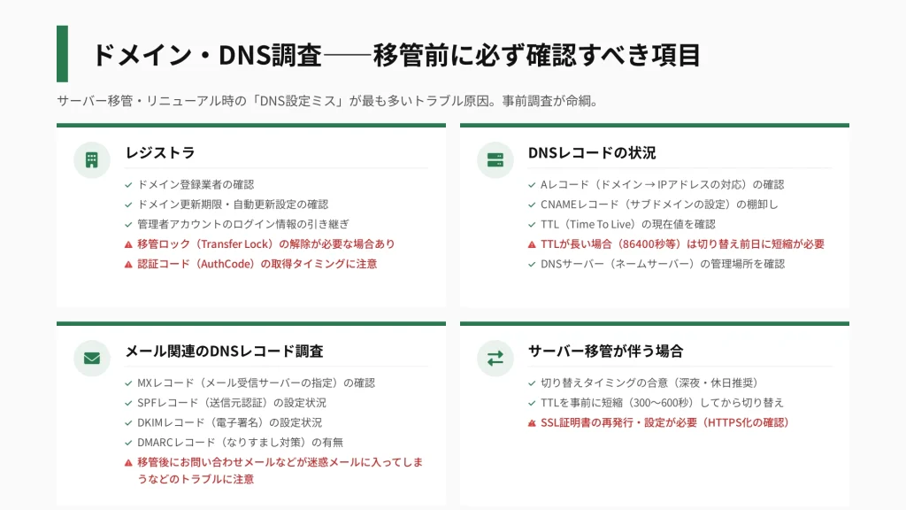 サーバー移管やリニューアル時、ドメイン・DNSについて確認不足があると、そもそもサイトが公開できない・・・という事態にもなりかねません。