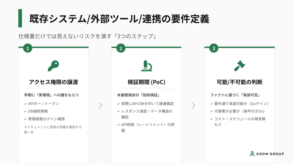 この時、顧客からは早めにツールへのアクセス権限の譲渡をしてもらい、連携が可能かどうかの検証を行ったうえで、実装の可否を判断し、そのうえで対応を行っていく必要があります。