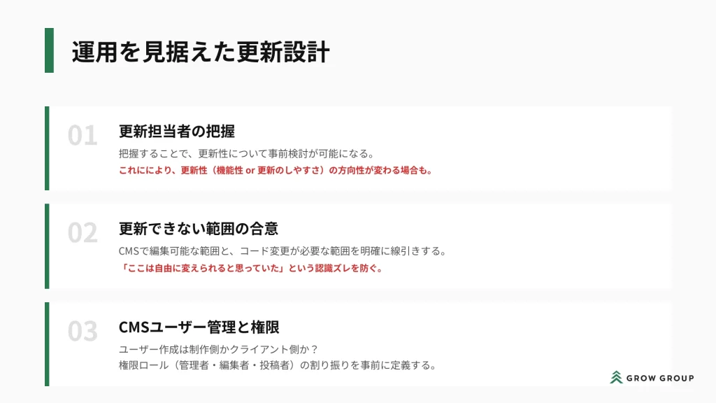 ユーザーにとっての機能性や更新のしやすさを考えたとき、上記の3点についても把握しておく必要があります。