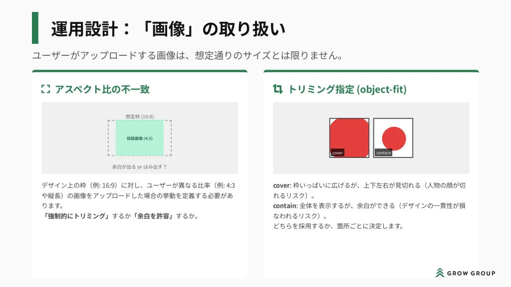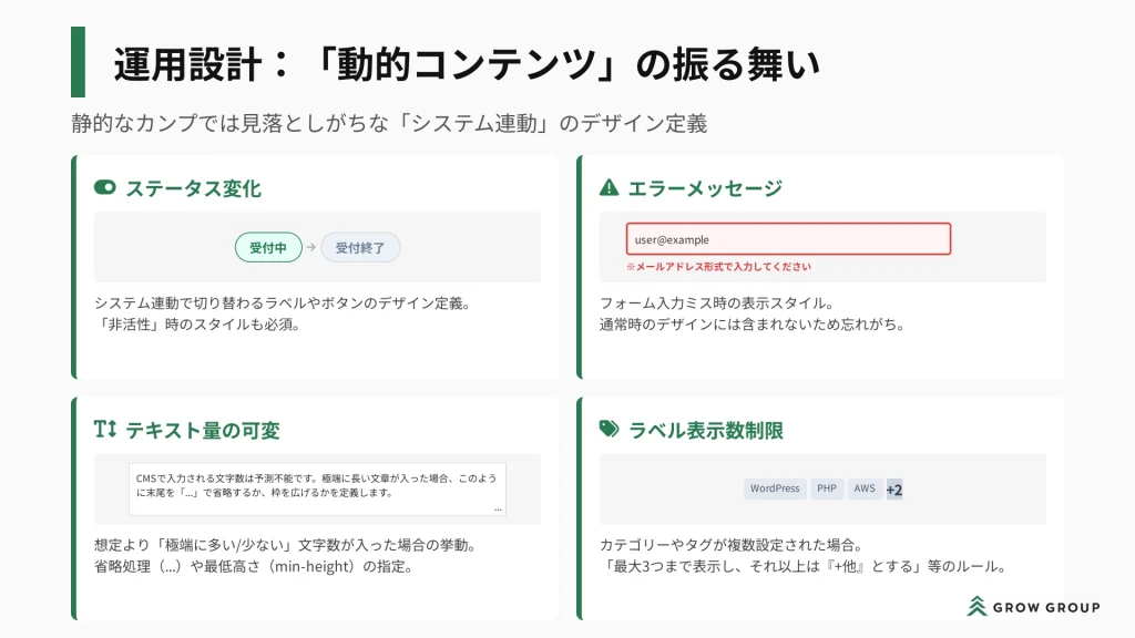 さらに、動的コンテンツや画像の取り扱いなどについては、デザインカンプではその挙動(どう変化するか、制限など)を見落としがちになるため、これらについても事前に取り決めておくのがおすすめです。