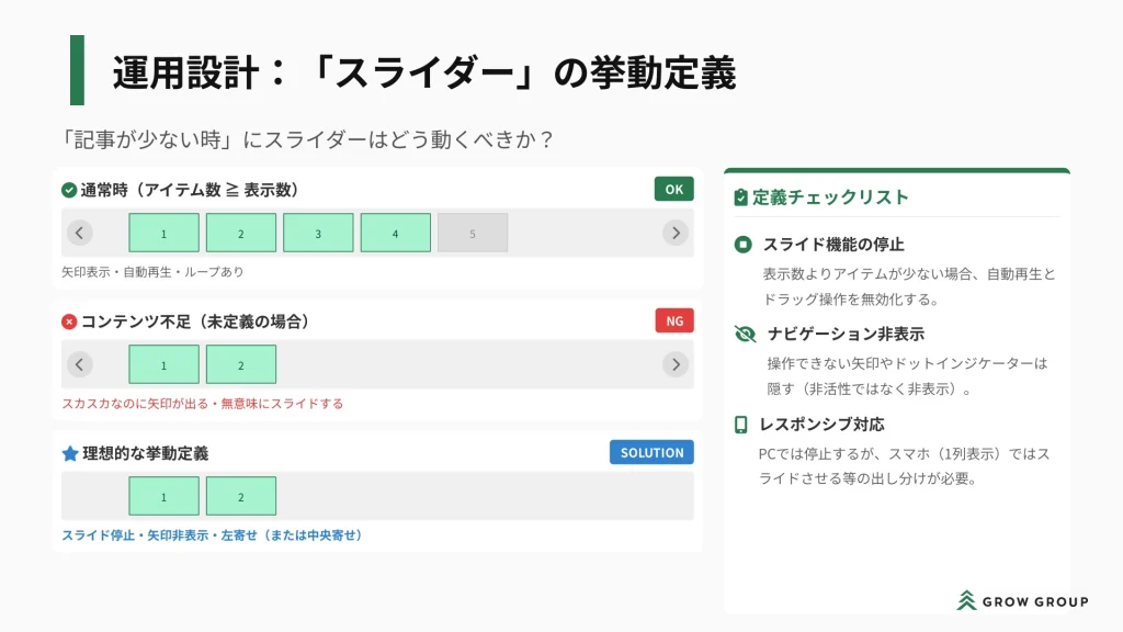 例えば、サイトに掲載する「セミナー情報」はどういったルールで「開催終了ステータス」に移行するか?など、細かい運用ルールや機能要件、テキスト量の変動(少ない場合・多い場合)などを事前に把握・定義しておくことが重要で、そのうえでデザインを作成することで、後の手戻りやエンジニアとの認識のズレを大きく減らすことができます。