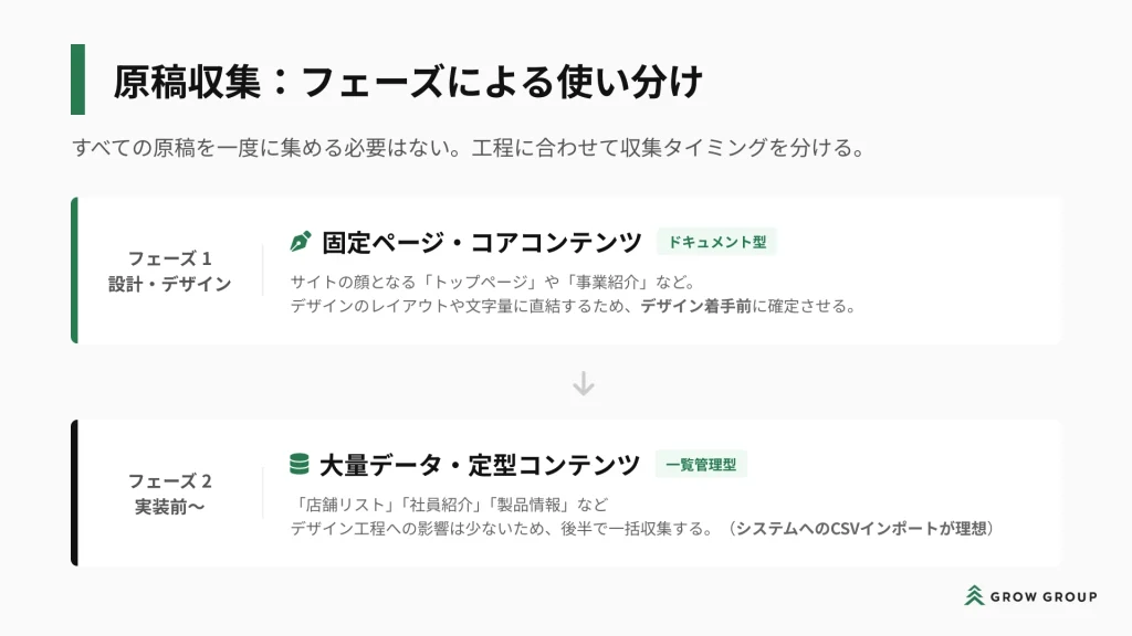 原稿の収集を行う際はフェーズによって収集のタイミングを分けると、顧客側の負担も少なくおすすめですが、この辺りも顧客とあらかじめ合意を取っておくとよいでしょう。