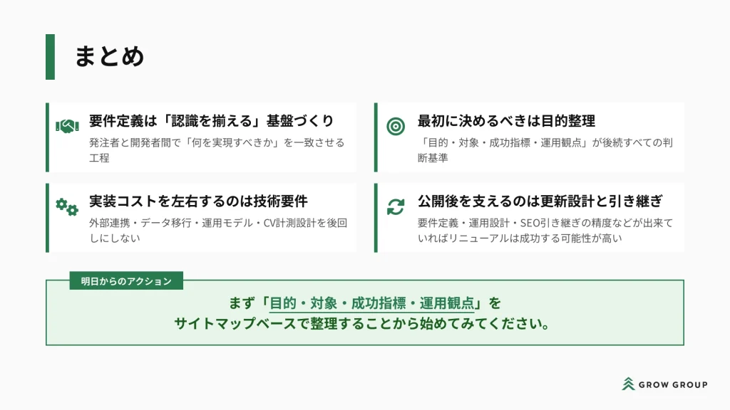 まずは、目的・対象・成功指標・運用観点を、サイトマップベースで整理することから始めてみてください。